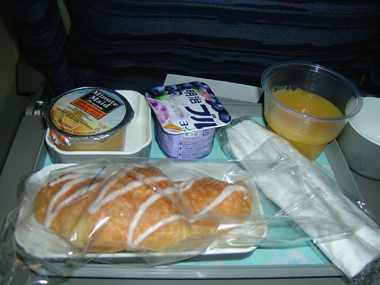 着いたとたんに遊ぶため、気合を入れて寝る。途中何度か目が覚めつつもまあ順調に眠れました。起きたらお絞りが配られて……というのを期待したんだが、お絞りはなかった。CAが回ってきて起き抜けに朝食を配られる。仕方がないので、ウェットティッシュで顔を拭く。ちなみにすっぴんです♪