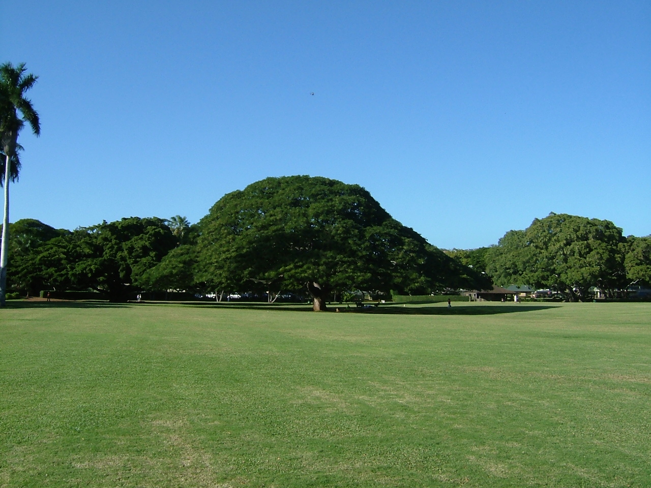 この木何の木~♪の日立の木。 モンキー・ポッドという木だそうです。 2本の木を1本に見えるように撮ってるとのことなので、真似してそう撮ってみました。 | |