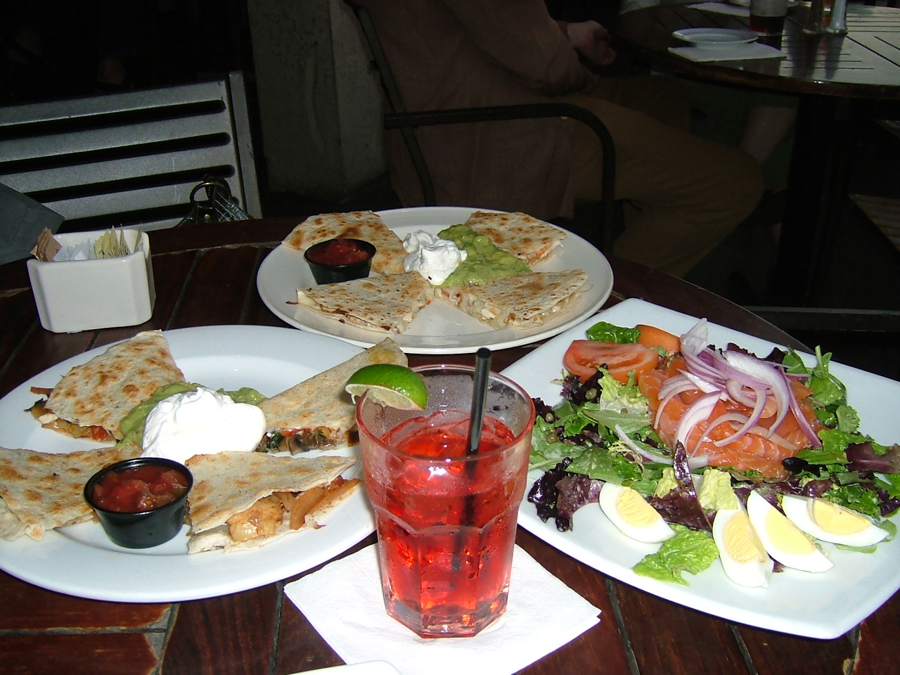 クレープみたいな生地に挟んだピザみたいなもの(名前忘れた)をチキンベースとお野菜ベースの2つとサーモンサラダをオーダー。
